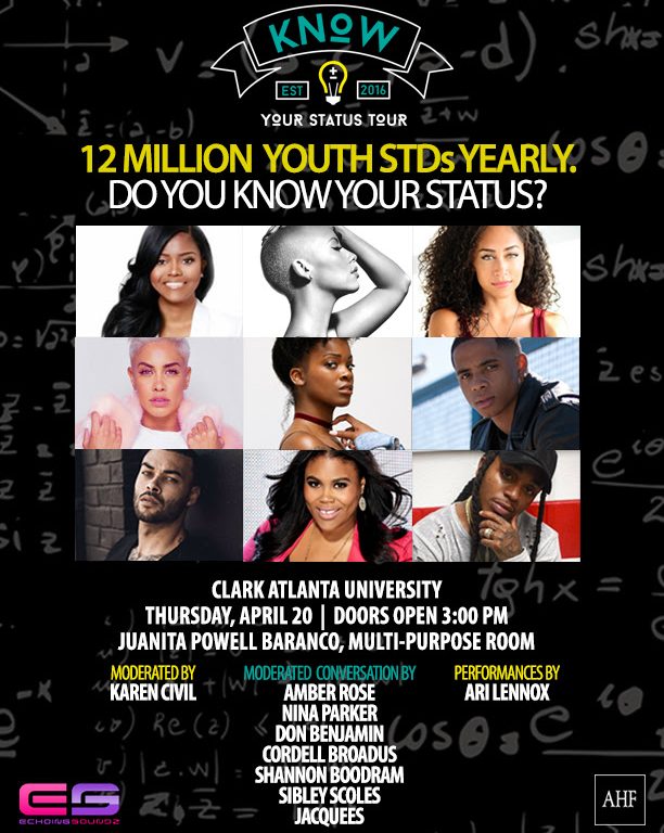 The Know Your Status tour will stop at Clark Atlanta University’s Juanita Powell Baranco, JD Multi-Purpose room on Thursday, April 20th at 3:00 p.m. and will feature a live music performance by Ari Lennox and celebrity panelists including Amber Rose, Jacquees, Don Benjamin, Cordell Broadus, Sibley Scoles and sex expert Shannon Boodram. Social media strategist Karen Civil will moderate the discussion.