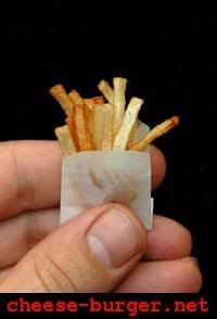 Thanks to hercuteness from Craftster.org Forums for making the smallest cheeseburger in the world! This is a real edible cheeseburger made with real miniature buns and complete with a micro portion of fries…