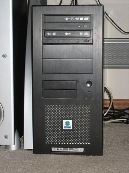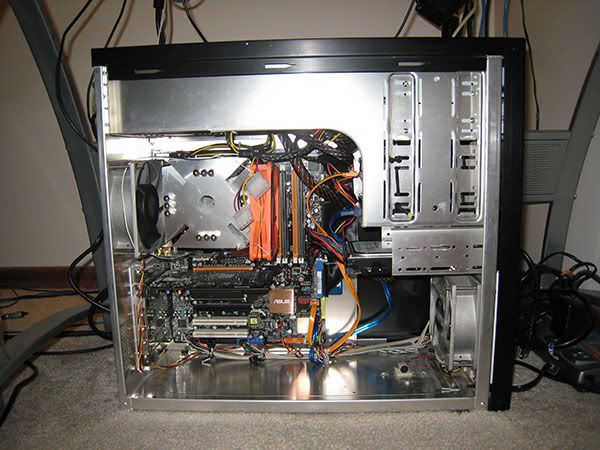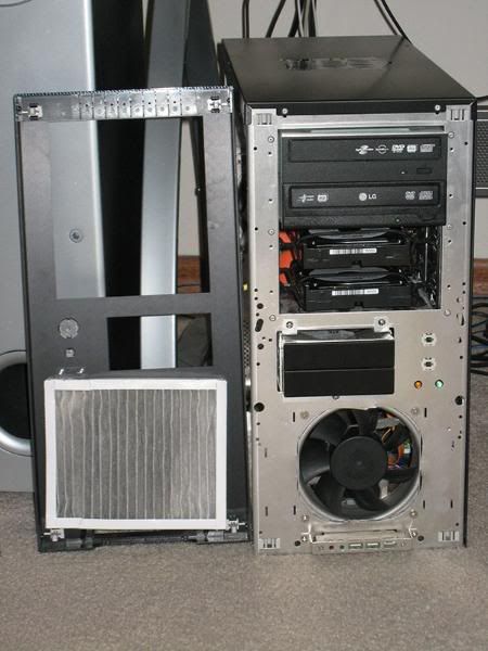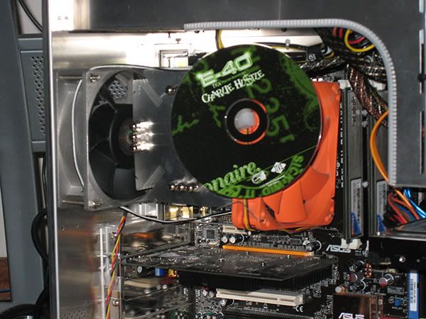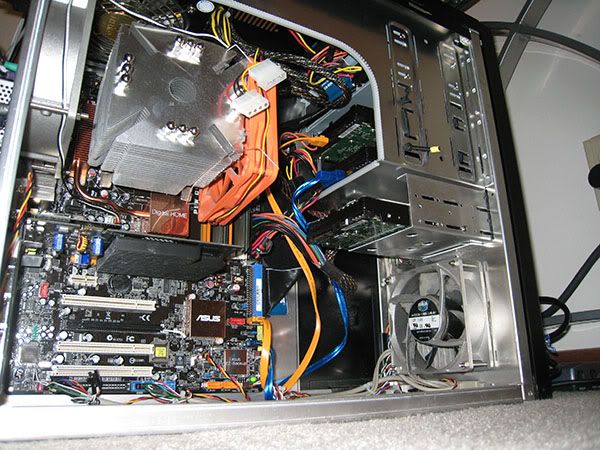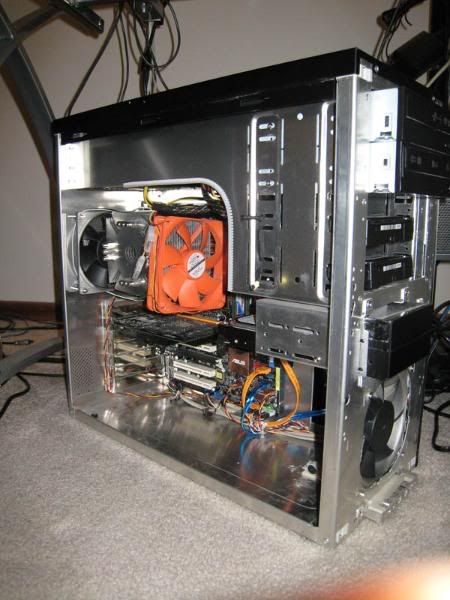 Intel Core 2 Duo E6600, 2x74GB 10,000rpm Raptors in Raid 0 (+ 1 extra not hooked up in floppy bay) & suspended in the cd bay w/ elastic cord, 2x1gd DDR2-6400 ram, Asus P5WDH passive mobo, XFX 7600GS passive gfx card, LG & Benq dvd-rw's, Liberty Enermax modular psu, scythe ninja heatsink w/120mm (cd size) nexus fan + 2 other aluminum case fans, 3m filtrete air cleaner filter which keeps damn near all the dust out of my comp, all in a Lian-Li case. I haven't opened it in months, and as you can see, there is very little dust.
