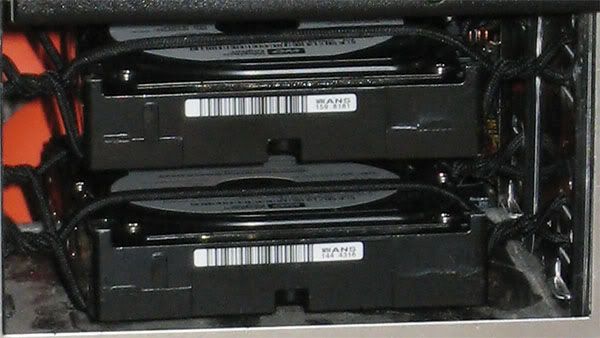 Why the hard drives in the cd bay? Well, the Raptors spin at a faster rate and cause more vibration which transfers to the case and creates noise. Suspending them with the elastic cord absorbs the vibration and makes a HUGE difference in noise.